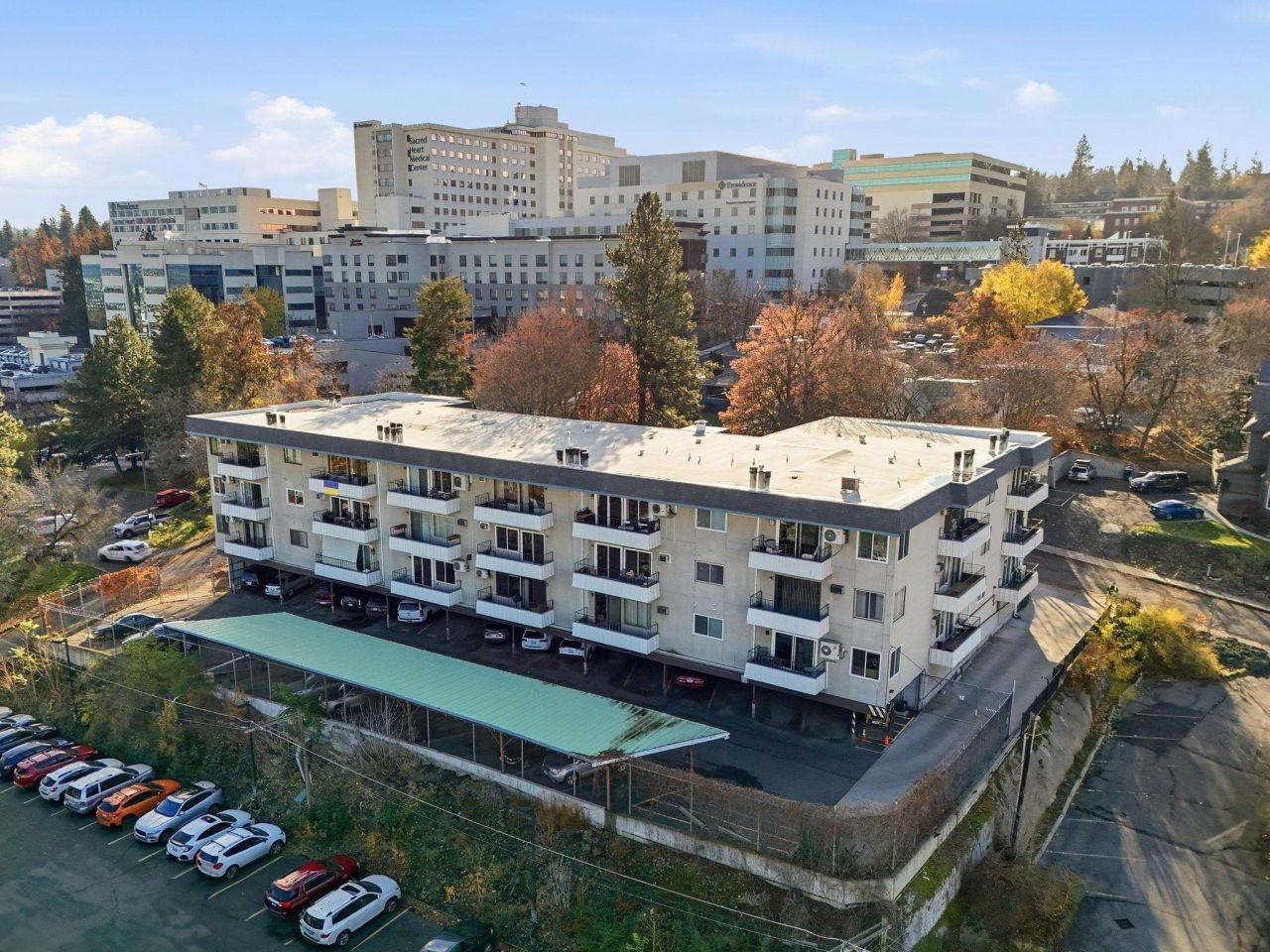 Secure, simple living in a convenient Spokane location. This gated, corner condo on the lower South Hill offers true first-floor living with no yard work and no exterior maintenance: perfect for anyone looking to simplify. Located just minutes from Sacred Heart and Deaconess, and only 2 minutes to downtown Spokane - convenience doesnt get much better than this. Inside, youll find a comfortable living space with a cozy fireplace, great natural light, and room to relax or entertain. Step out to the balcony for views of downtown Spokane. Additional perks include: a designated carport plus an extra parking space, guest parking, and a secure storage area. This home is ideal for anyone in search of lock-and-leave living (where you dont have to be the one dealing with any exterior maintenance!) Plus having hospitals, restaurants, shopping, and freeway access all close by?? The icing on top!